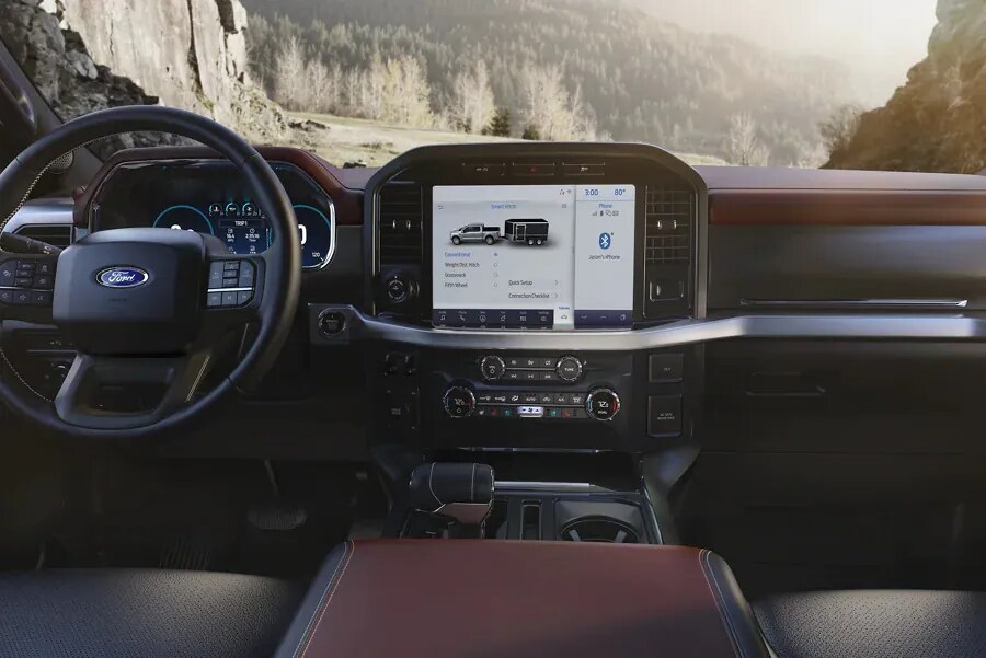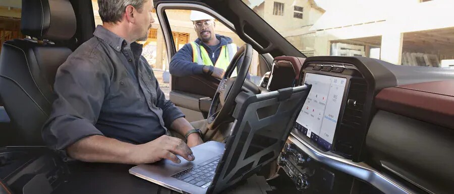 An F-150® tows, hauls and grinds all day long, so you know it's not going to shy away from a little paperwork. The all-new F-150® interior puts productivity at the forefront. So check off your to-do list from the cab, where an available Interior Work Surface, SYNC® 4 and available 12-inch productivity screen are at your disposal.